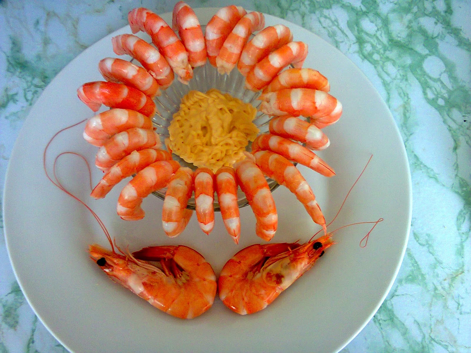 - din galbenusuri si ulei faceti o maioneza tare , apoi stoarceti jumatatea de lamaie si puneti sare dupa gust, si amestecati bine, va iesi o maioneza molicica, dar acruta, numai buna pentru fructe de mare! Puneti maioneza intr-un pos , si ornati farfuriuta sau castronelul pe care urmeaza sa puneti crevetii!